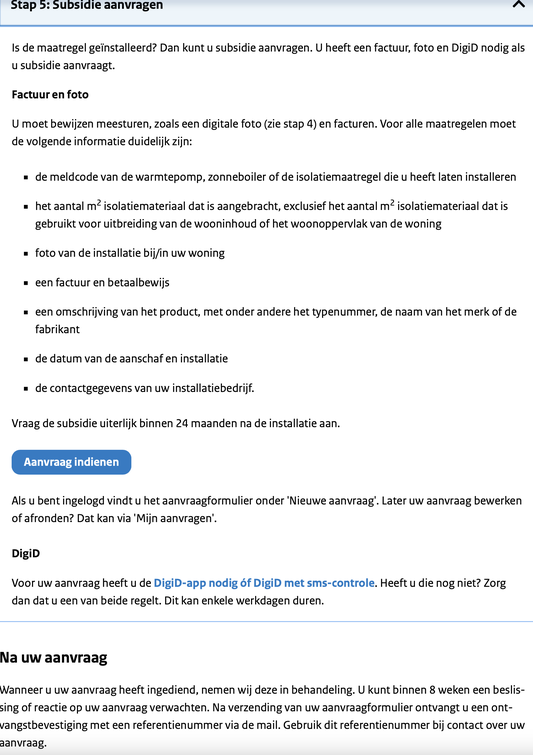Bewijs van uitvoering: Bij sommige regelingen kan het nodig zijn om bewijs van de uitgevoerde werkzaamheden in te dienen, zoals facturen of een rapport van een energieadviseur.